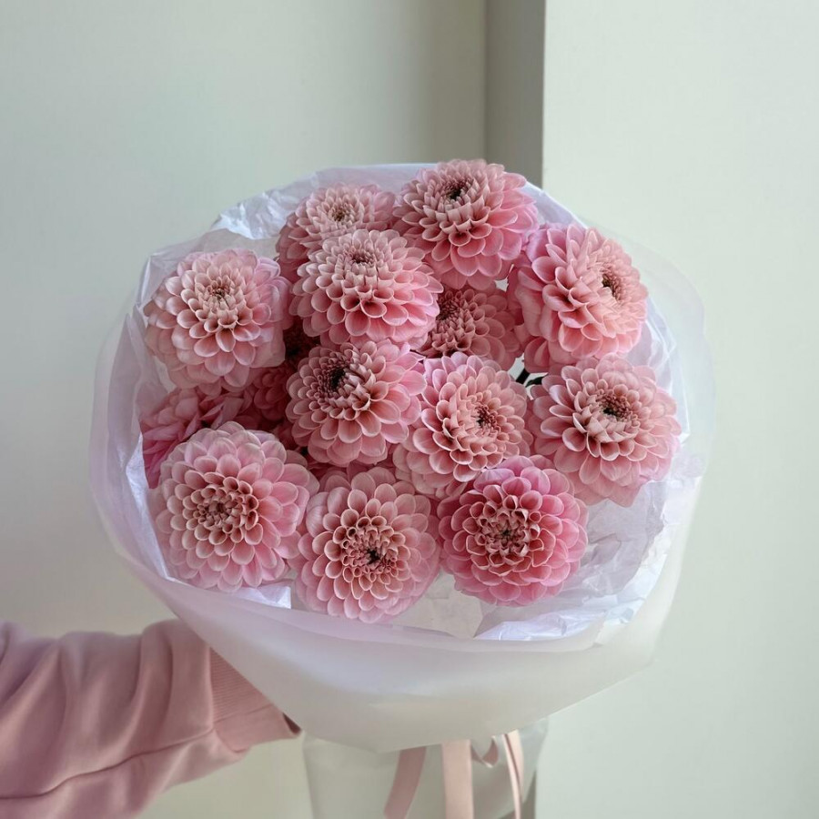 На фото букет из 15 розовых георгин. В составе: георгина 15 шт, дизайнерская упаковка 2 шт, атласная лента 1 шт, . Все цветы свежие и ароматные, букет красиво оформлен и отлично подходит для подарка. Доступна доставка цветов или самовывоз.