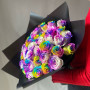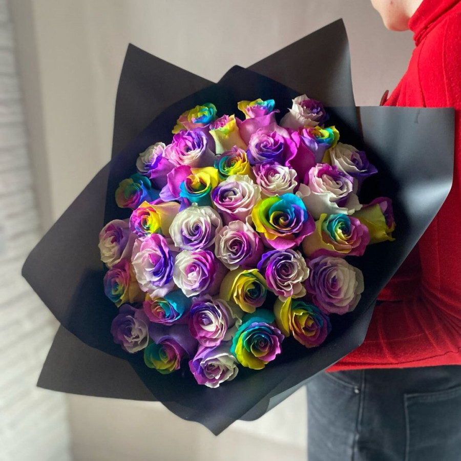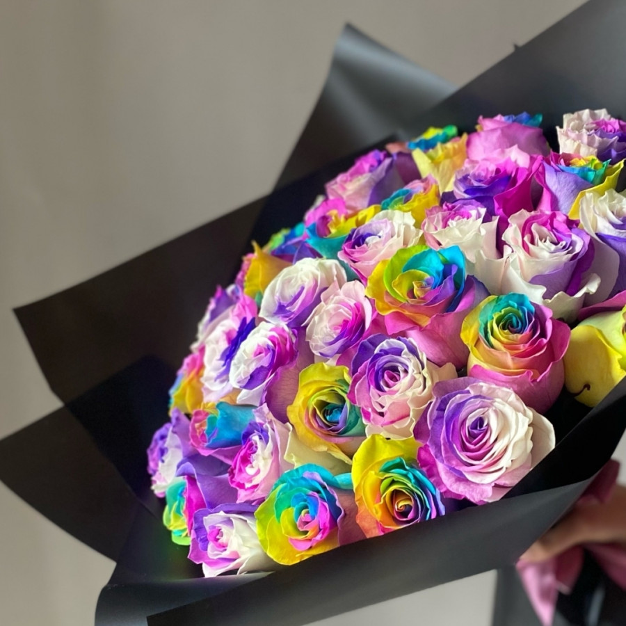 На фото букет из 41 радужной розы. В составе: роза 41 шт, крафт-бумага 1 шт, атласная лента 1 шт, . Все цветы свежие и ароматные, букет красиво оформлен и отлично подходит для подарка. Доступна доставка цветов или самовывоз.
