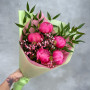 На фото букет из 5 коралловых пионов и гипсофил. В составе: пион 5 шт, гипсофила 1 шт, рускус 3 шт, крафт-бумага 1 шт, атласная лента 1 шт, . Все цветы свежие и ароматные, букет красиво оформлен и отлично подходит для подарка. Доступна доставка цветов или самовывоз.