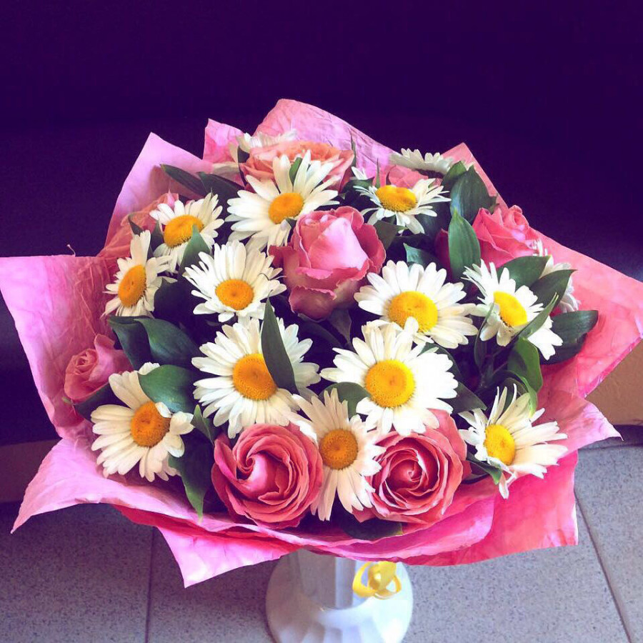 Необычное сочетание солнечных маргариток и розовых роз - это яркий летний букет, который удивит получательницу изяществом и неповторимым исполнением. Летнее настроение, тепло и игривость ромашек в сочетании с классикой кружевных лепестков эквадорских роз станет восхитительным подарком для современной девушки.